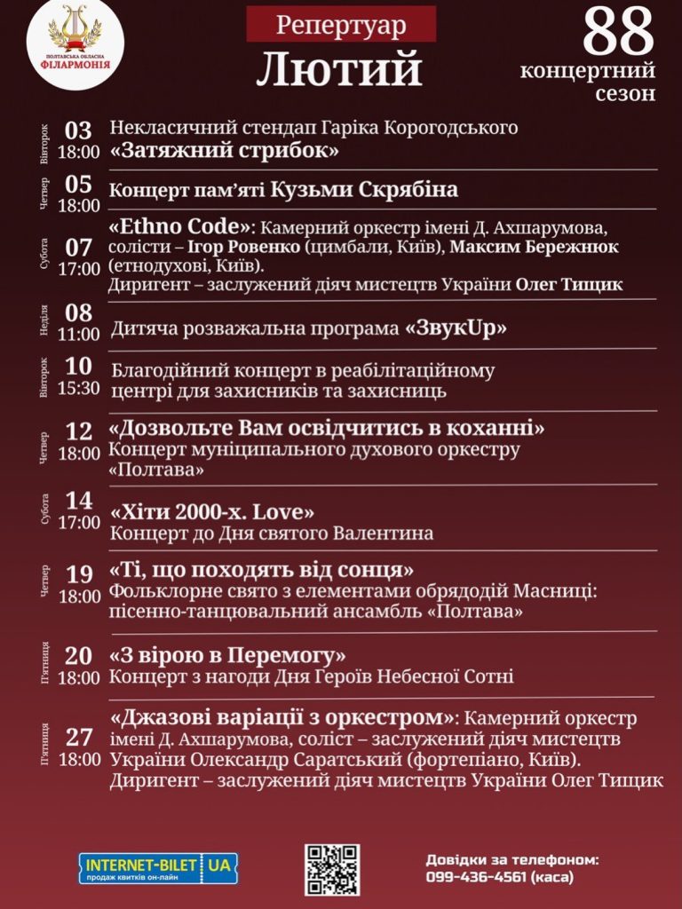 Нова афіша полтавської обласної філармонії Нова афіша філармонії м. Полтава на лютий 2026 року Афіша Полтавській обласній філармонії на січень 2026 року Що буде у Полтавській обласній філармонії у 2026 році?
