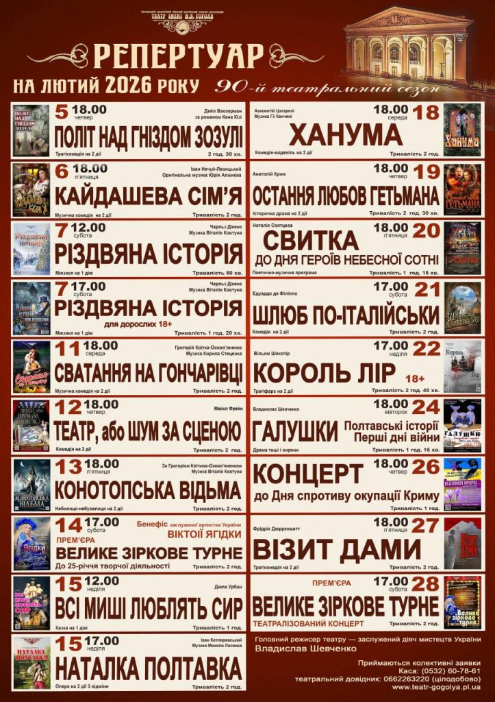 Афіша театру Гоголя Полтава Що буде у театрі імені Гоголя Полтава у лютому 2026 року. Нова афіша Нова афіша театру імені Гоголя Полтава на січень 2026 року